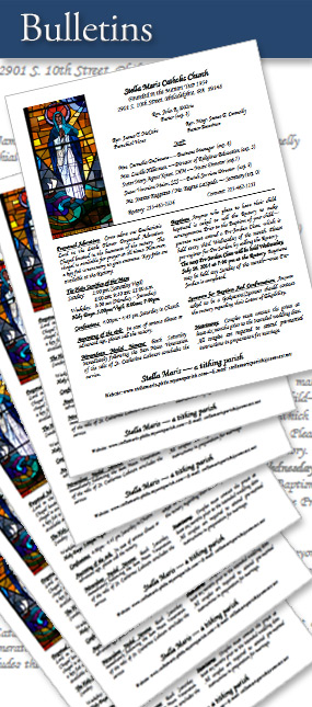 The Stella Maris parish bulletin is available here in PDF format. This will allow you to see the bulletin as it appears in print. (Not all dates are currently available) Please note that reading PDF files requires the free Adobe Acrobat Reader